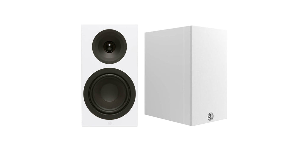 Elegantti hyllykaiutin Tanskasta, skandinaavinen muotoilu. Satiinimusta ja satiinivalkoinen viimeistely.
