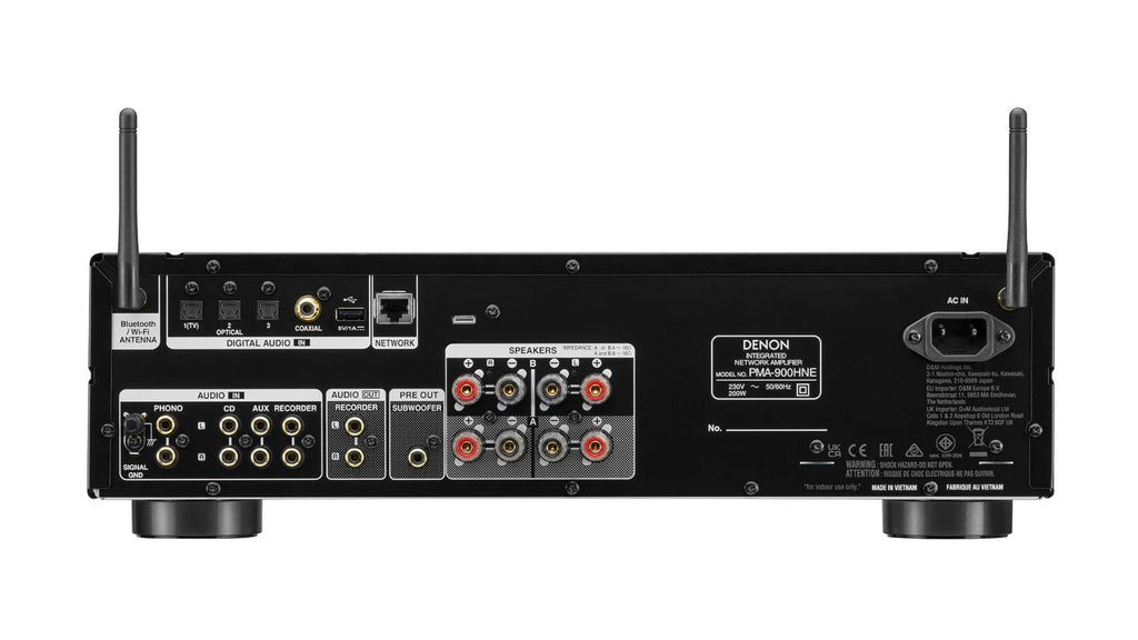 Denon's PMA-900HNE integrated stereo amplifier features advanced high-power amplifier technology that ensures top-level sound quality from analog and digital sources. Denon's PMA-900HNE enhances your listening experience from any source, including MM and MC-Phono connection for turntable, TV audio digital connection (optical Toslink) and streaming of music services with built-in HEOS® system! The fine appearance is complemented by a high-quality feel throughout. The front plate of the amplifier is aluminum. Like Denon, the remote control is ergonomic and easy to use.