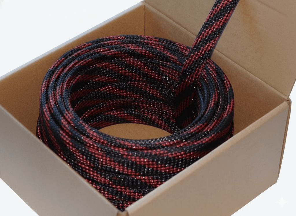 High quality and durable nylon protective sleeving for cable protection and decoration. Diameter 6 mm, expands to 12 mm, suitable for 4 -12 mm cables. Max continuous temperature 125 degrees Celsius, melting temperature 250 degrees Celsius