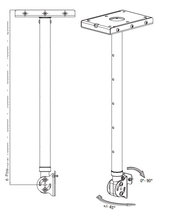 Six different height options can be set; 700mm, 800mm, 900mm, 1000mm, 1100mm and 1200mm. 90 degree downward tilt. A hollow round tube with an inner diameter of 50 mm. Available in black and white.