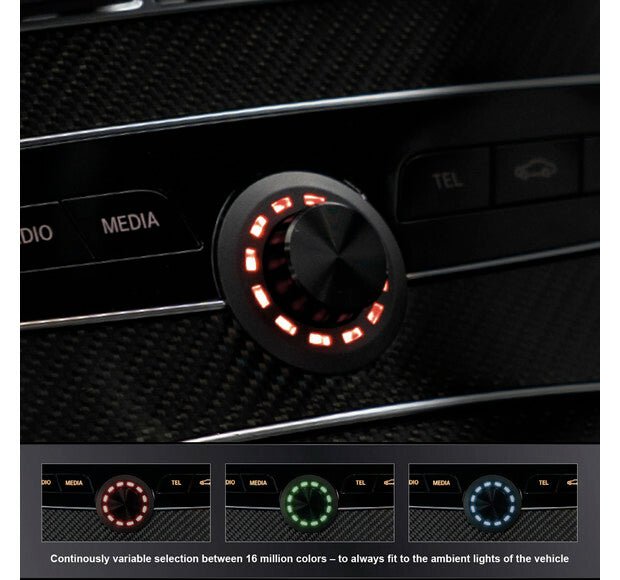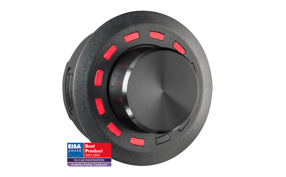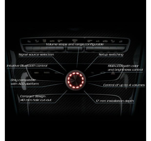 (Master, digital, HEC / AUX, subwoofer, rear.) • Selectable volume range (60 dB, 24 dB, 12 dB). • Selectable volume steps (1 dB, 0.5 dB). • Own color for each configurable volume setting. Sound setting selection between 10 memory locations. Bluetooth playback control and pairing activation (only with Bluetooth expansion card). 12 x RGB LEDs for visual feedback. • Wide color space, more than 16 million colors. • Brightness and automatic dimming ( configurable ). Easy installation. • Flush mounting in a Ø 40 mm mounting hole. • 5 m wiring harness Management and upgradeability with DSP PC-Tool software. (DSP PC-Tool 4.75a or later).