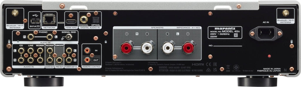 The Marantz Model 40n is a new high-quality stereo amplifier that meets today's requirements. The device has an HDMI ARC connector, network features, a MM record player connection, and a slew of connectors such as the power stage input.