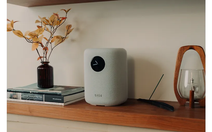 Minimalistinen ja kompakti muotoilu sopii hyvin erilaisiin tiloihin, kuten hyllylle, pöydälle tai yöpöydälle. Kaiutin on myös seinäkiinnitettävä, jolloin se säästää tilaa. Musta verhoilu ja pyöreä näyttö tuovat modernin ilmeen kodin sisustukseen.