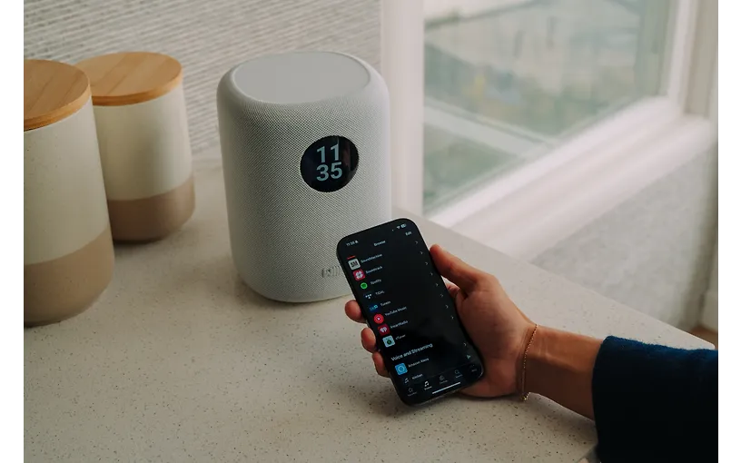 Pyöreä, korkearesoluutioinen kosketusnäyttö tarjoaa nopean ja suoran hallinnan ilman puhelinta. Näytöltä voi helposti vaihtaa kappaletta, säätää ääntä, valita lähdettä ja muokata EQ-asetuksia. Näyttö näyttää albumitaiteen, kappaletiedot ja kellonajan, ja sen ulkoasua voi personoida esimerkiksi eri kellotauluilla ja taustakuvilla.