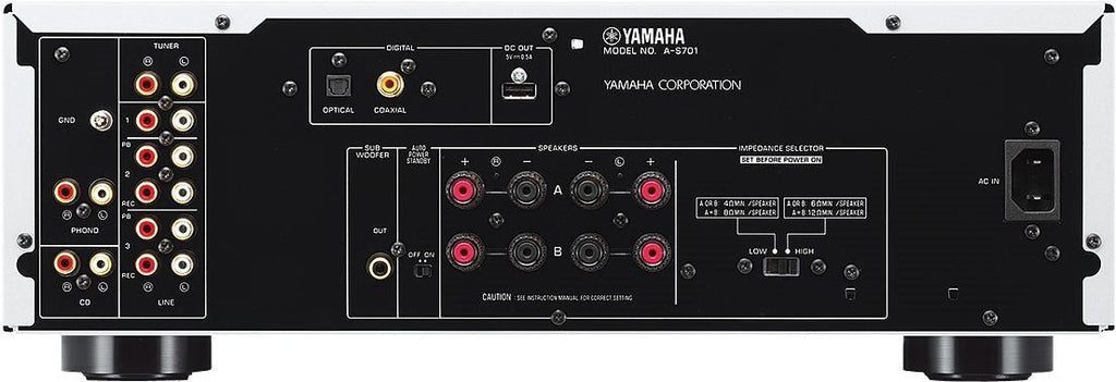 Specially made transformer, specially made coupling capacitors, two direct signal path speaker relays, single point grounding, aluminum pressed cooling plates and several other components that affect top-class sound reproduction. In this new model series, component choices and sound fine-tuning have been carried out in Europe, corresponding to European listening habits and construction materials. CD Direct amplification and Pure Direct mode for the purest sound quality level. Through CD and Pure Direct connection, the signal path is shortened even more. Switching on the function bypasses all factors affecting the sound, such as tone controls, Loudness and balance. The gold-plated speaker connector terminals guarantee a high-quality connection and reduce signal loss. The Yamaha AS701 model has gold-plated speaker terminals and analog connections.