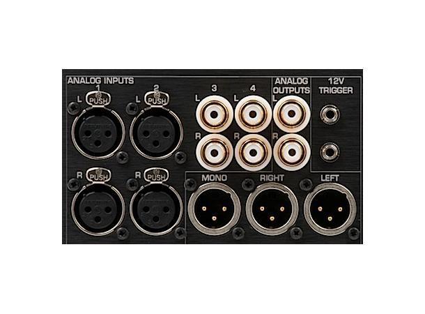 The headphone output of the THX-888 amplifierfeatures a 1/4" TRS and a 4-pin XLR. Both outputs deliver the full performance of the HPA4. However, we recommend the XLR4 due to its lower contact resistance. The HPA4 features two balanced stereo inputs and two unbalanced stereo inputs. The line amplifier provides one balanced stereo output, one balanced mono sum, and one unbalanced stereo output.