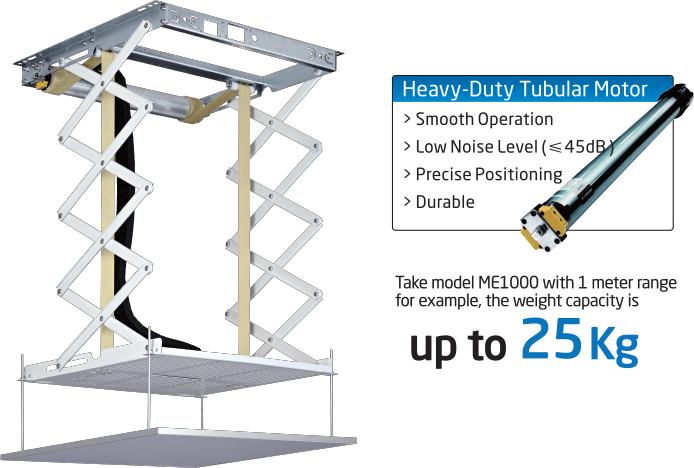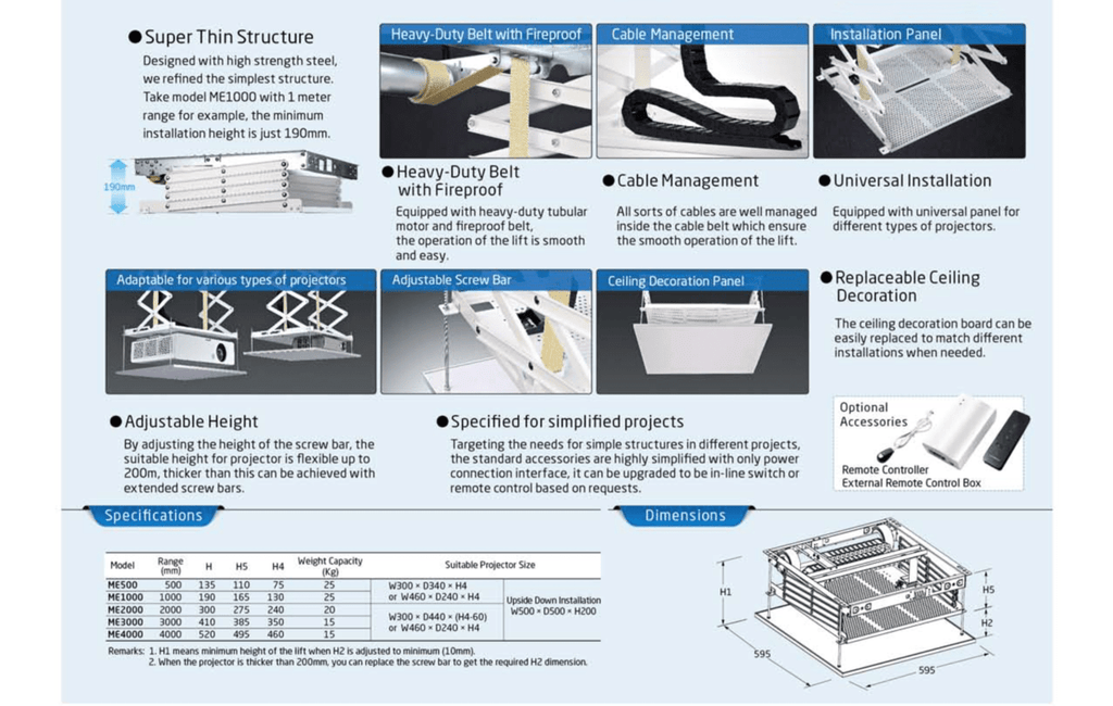 Rakenteeltaan erittäin ohuet, mutta tukevat mekanismit mahdollistavat hissijärjestelmän asennuksen myös ahtaammissa tiloissa. Tehokas moottori sekä tukeva mekanismi huolehtivat että projektori asettuu tasaisesti ja tarkasti aina sille määritellylle korkeudelle. Kaapelit projektorille viedään suojatusti sekä turvallisesti näille varattua saranoitua johtokourua pitkin. Katselun jälkeen hissin hiljainen moottori vetää projektorin rauhallisesti suojaan esim. Välikattoon. Projektorihissi liitetään sähköverkkoon helposti pistotulpalla, hallinta sähköjohtoon liitetyn ohjauskeskuksen painikkeilta tai RF kaukosäätimeltä. Halutessasi voit lisätä käyttömukavuutta ohjaamalla projektorihissiä suoraan, esim. projektori, vahvistin tai Blu-ray soitin käynnistettäessä, grandviewltä lisävarusteena saatavilla olevien “Power relay trigger set" sekä “Wireless trigger set” tarvikkeiden avustuksella.