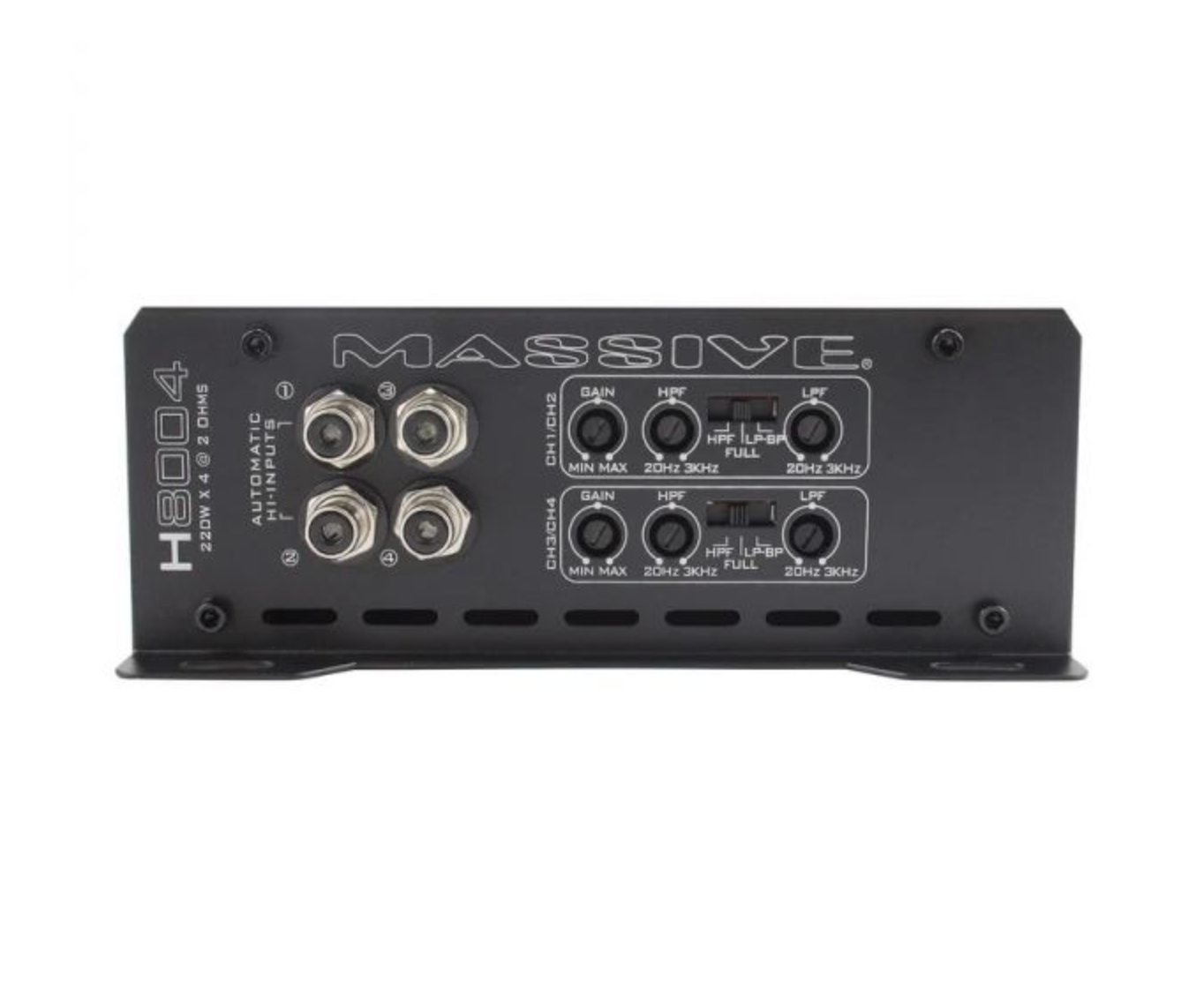 Outside you will be impressed by a smooth brushed black aluminum surface with our logo glowing radiantly in blue, announcing to the world you have MASSIVE equipment. The top of the unit includes a Digital Voltage LED Display with Power, Clipping & Protection Indicators allowing you to monitor your input power to help protect your investment. Furthermore, the built-in cooling fan will help keep your PCB cool during extended operating times and hot conditions.