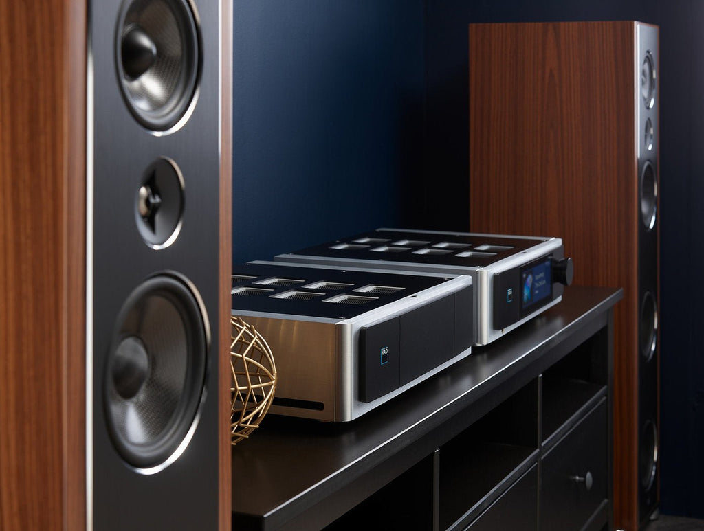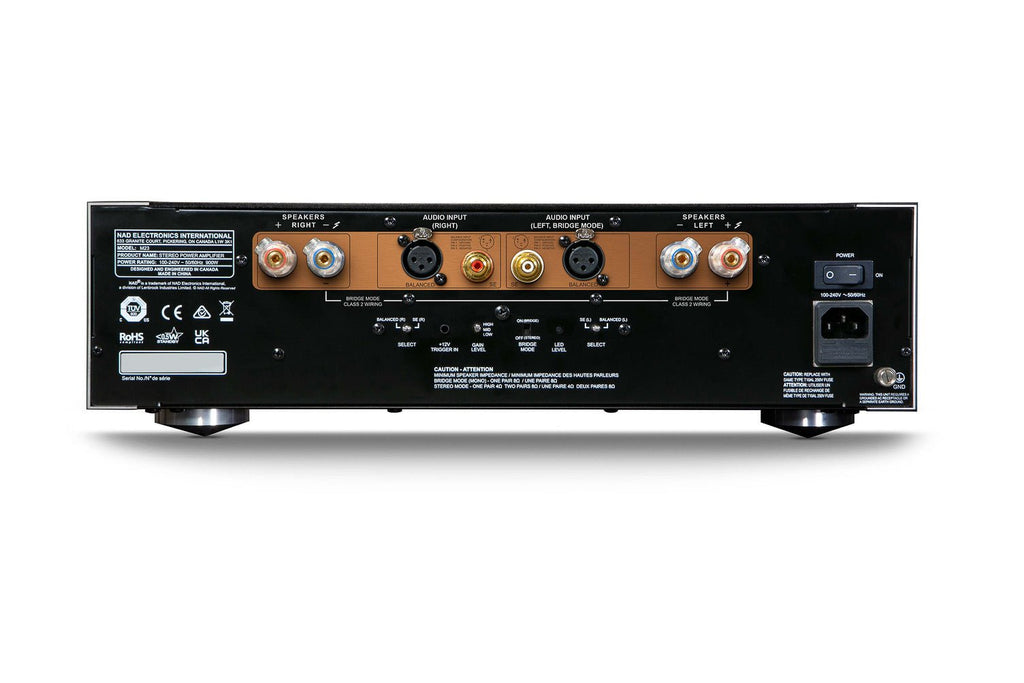 The M23 employs Eigentakt™ class-D amplifier modules manufactured by NAD under license from Denmark’s Purifi Audio. Purifi’s load-invariant design provides wide, flat frequency response, even into challenging loudspeaker loads. Noise, harmonic distortion, and IM distortion are virtually unmeasurable at all frequencies and output levels. Another benefit of the Eigentakt™ design is extremely low output impedance and correspondingly high damping factor, for iron-clad control of the loudspeaker output. NAD combines the Eigentakt™ design with our own sophisticated switched-mode power supply, which can provide additional reserves of current when needed. Amazingly powerful and transparent, the M23 can deliver 2x260W of peak power into 8 ohms and 2x520W into 4 ohms.