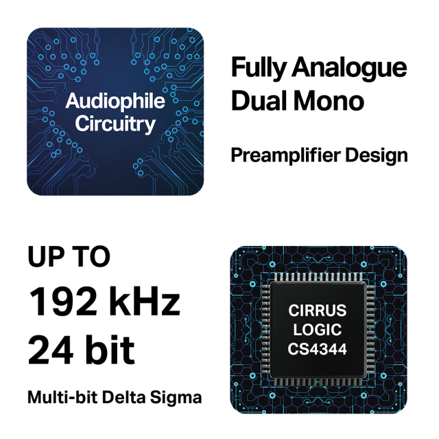 Audiofiileille suunnatut analoginen ja digitaalinen piirit ovat suunniteltu maksimaalista signaalin puhtautta ja musiikillista autenttisuutta varten. Vähäkohinainen analoginen rakenne on optimoitu huolellisesti lyhyillä signaaliteillä dynamiikan, sävytasapainon ja hienojen yksityiskohtien säilyttämiseksi ilman tarpeetonta prosessointia. Korkean resoluution digitaaliset lähteet muunnetaan ensiluokkaisen 24-bittisen/192 kHz:n DA-muuntimen avulla, jossa on tarkka sisäinen kellotus minimoiden jitterin ja varmistaen tarkan ajoituksen. Digitaalisten ja analogisten osien erottelu toisistaan estää kohinan heikentämästä signaalia. Tuloksena on puhdas, luonnollinen ja mukaansatempaava ääni, joka heijastaa uskollisesti jokaisen ohjelmalähteen luonnetta.
