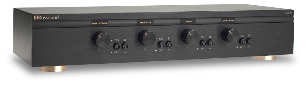 The SDB-4.1 is a highly efficient dual-source speaker selector that controls up to four pairs of speakers. The front panel provides a separate volume control for each speaker pair, allowing you to adjust the volume in each room from one convenient location.